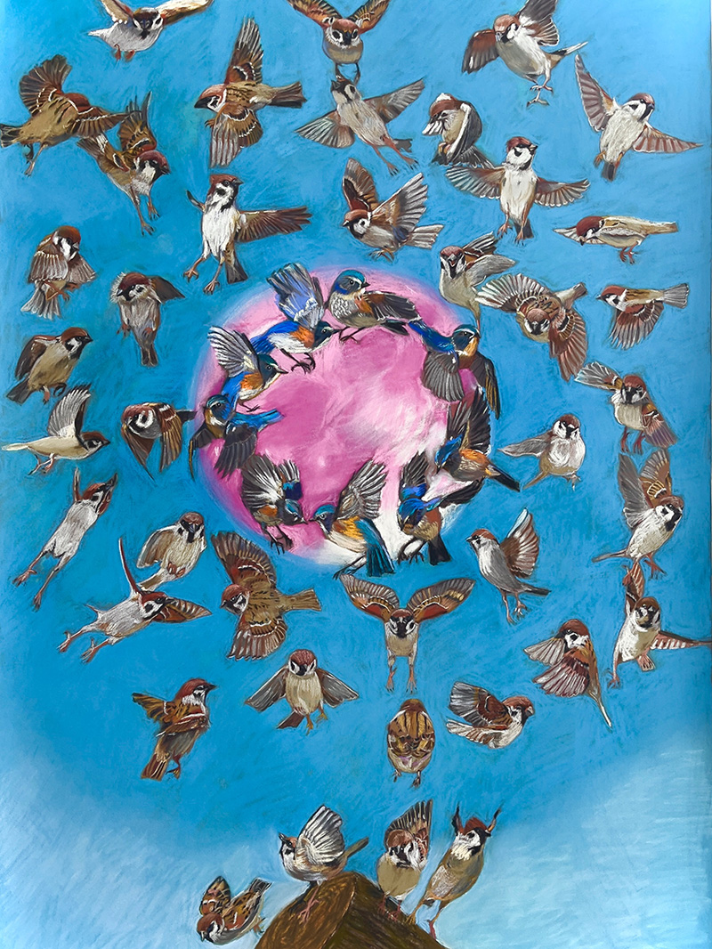 What you see here are sparrows and red-flanked bluetails soaring through a beautiful sky. Yet, the presence of the Strawberry Moon overshadows the seemingly tranquil atmosphere. This scene represents a world in which the sky no longer offers birds sanctuary. The decaying tree symbolizes the dearth of safe perches for birds to alight, thus leaving them to wander aimlessly, their fate uncertain.