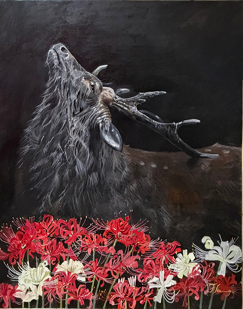 私がこの鹿と初めて出逢ったとき神々しい姿に魅了されました。鹿は神々を乗せ時空を超え行き交うことができると伝えられてきました。 又曼珠沙華の花は葉を付けることなく咲く天界をイメージする花です。 このことを私は日本人の持つ『死生観』と言う題名で表しました。
